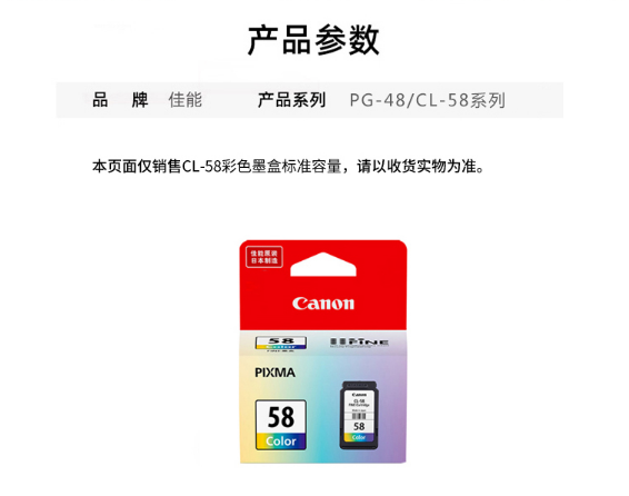 參數(shù) [品牌] 佳能 [型號] CL-58 [毛重] 60.00g [產(chǎn)地] 中國大陸 [類型] 帶頭墨盒 [單位] 個